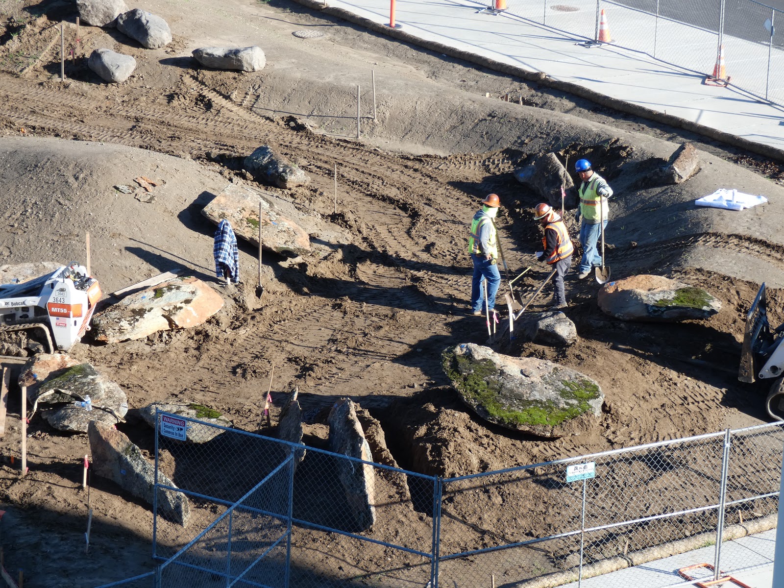 Something kind of extraordinary happened on campus this week. I was pausing between classes and saw a large truck and a crane downstairs in the staging area for the Great Valley Outdoor Nature Lab. The crane was dumping gigantic rocks onto the ground. "My" rock collection had arrived!! You might remember that early last month I went 'rock collecting' in the Sierra Nevada foothills for the rocks that will be part of the displays and landscaping of the outdoor. All 60 tons or so...